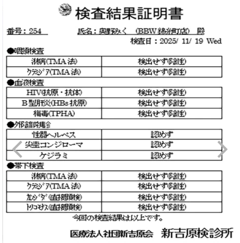 今月も♡ 写メ日記 2025.11.21 今月も全項目陰性でした🥰 性病検査は毎月キットではなく病院で検査をしてもらっています♡ 明日は13時〜出勤💓 楽しみすぎる😍 11/22(土)11/25(火)出勤💖奥野みく